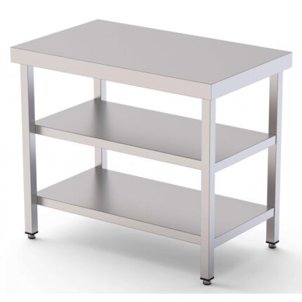 La mesa de trabajo central ofrece una amplia superficie de trabajo, ideal para cocinas con mucho flujo de trabajo. Su diseño robusto y funcional permite realizar tareas de preparación de alimentos y almacenamiento de utensilios de manera eficiente. Perfecta para negocios de hostelería que necesitan maximizar el espacio y mejorar la organización en la cocina.