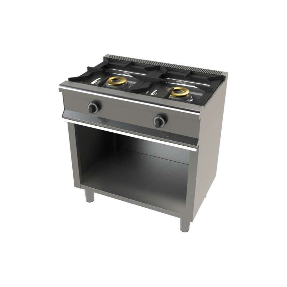 Cocina a gas con patas de acero inoxidable regulables en altura.