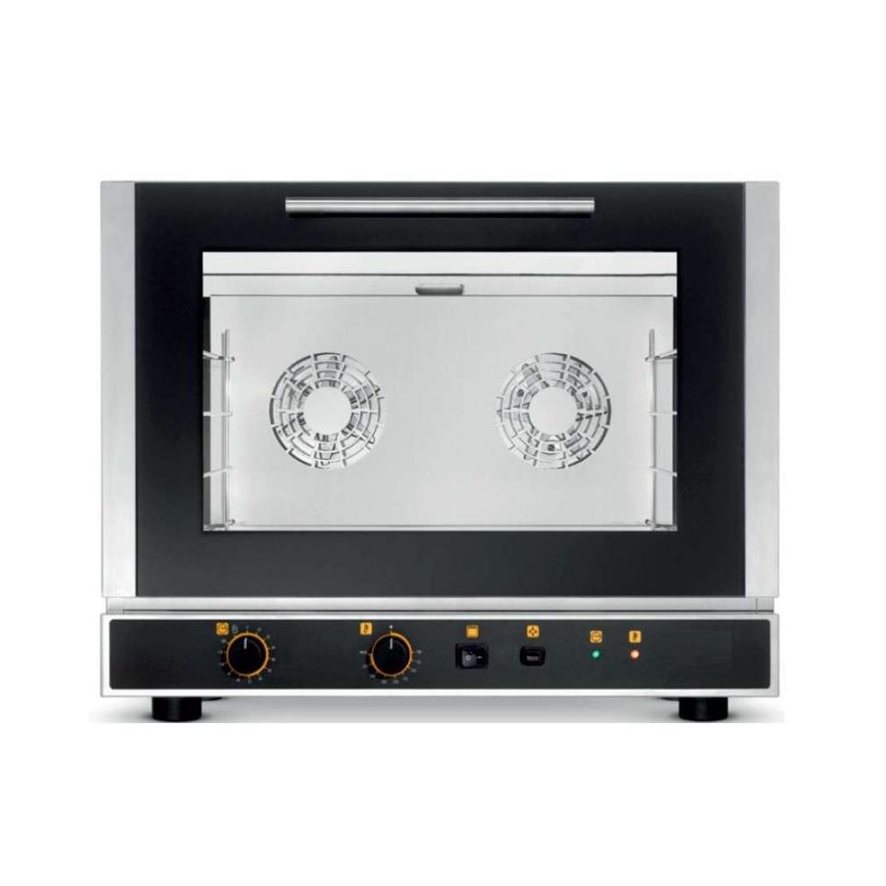 • Fabricados en Italia por fabricante de reconocido prestigio mundial que exclusivamente fabrica hornos. • Construidos en acero inoxidable en interior y exterior. • Posee las certificaciones más exigentes IPX3 y CB. • Control de temperatura por termostato de 50 a 300°C. • Panel de mandos electromecánico inferior. • Puerta ventilada con vidrio inspeccionable y apertura abatible. • Motor ventilador monodireccional o bidireccional según modelo. • Sistema de refrigeración forzado de los componentes internos. • Posibilidad de superposición. • Paso de guías de 83 mm. • Bandejas o parrillas no incluidas. • EF464.3 GRIL: Horno pensado para acompañar todos los días el trabajo de los restaurantes y snack bar de medio tamaño. Las propiedades calentadoras del motor y la función grill permiten dorar los productos. Un horno sencillo de usar gracias al panel de mandos electromecánico intuitivo con el cual puede programar los parámetros de cocción que desea.
