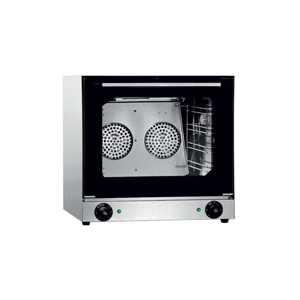 Con este práctico horno puede hornear, cocinar, descongelar y recalentar los alimentos y sus platos de comida. • Ideal para todo tipo de usos, desde pizzas a piezas de carne. La posibilidad de baja temperatura permite realizar también cocciones de alimentos al vacío. • Fabricado en acero inoxidable con puerta de doble cristal y luz interior. • Mandos situados en la base para evitar averías por la salida del vapor. • Regulador de temperatura ajustable de 50 a 300°C. • Dotado de temporizador acústico de 0 a 120 minutos. • Realiza una cocción uniforme de los alimentos gracias a dos elementos de calentamiento y dos ventiladores. • Según modelos, dispone de función de vapor y función grill. • La función vapor se realiza con una conexión de agua de 3/4" que tiene el horno en la parte posterior. Carece de depósito de agua. La inyección al vapor se hace de manera manual con un botón que hay en el frontal. • Dotado y Equipados con 4 bandejas. • Distancia entre guías de 70 mm.