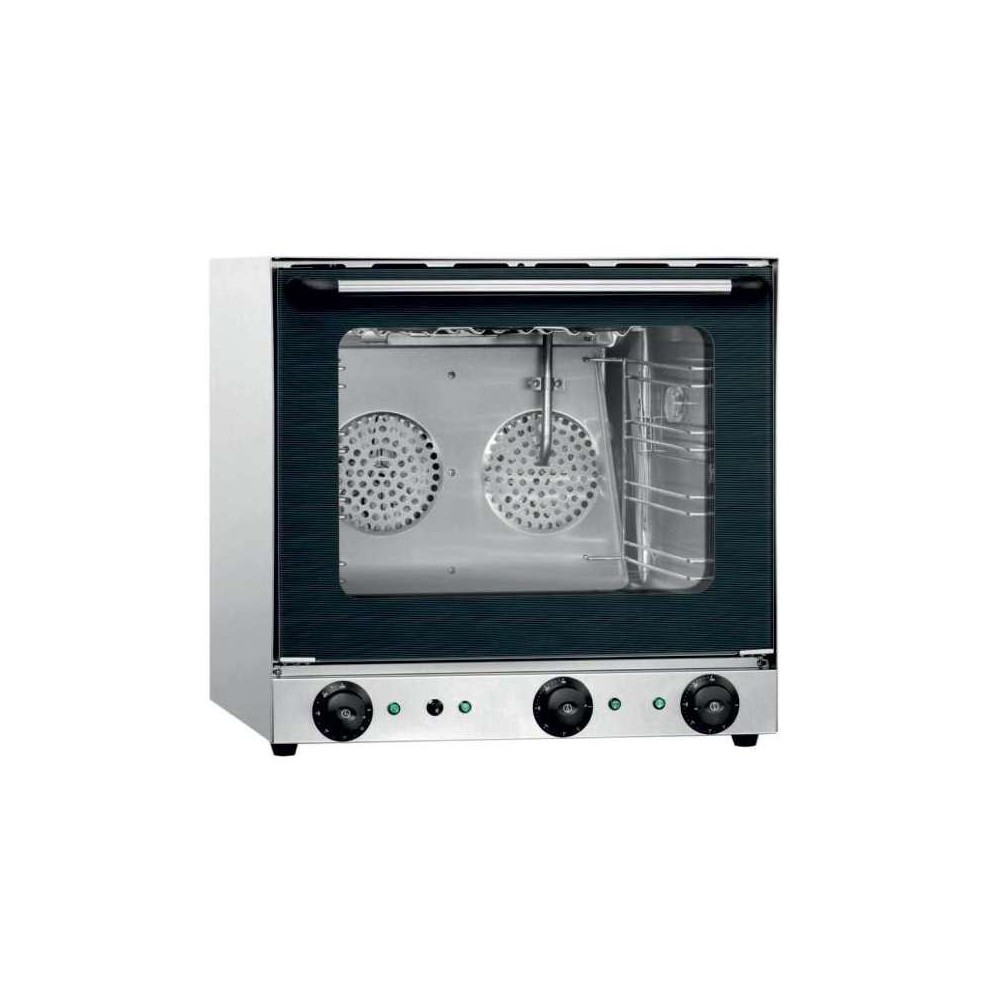 Con este práctico horno puede hornear, cocinar, descongelar y recalentar los alimentos y sus platos de comida. • Ideal para todo tipo de usos, desde pizzas a piezas de carne. La posibilidad de baja temperatura permite realizar también cocciones de alimentos al vacío. • Fabricado en acero inoxidable con puerta de doble cristal y luz interior. • Mandos situados en la base para evitar averías por la salida del vapor. • Regulador de temperatura ajustable de 50 a 300°C. • Dotado de temporizador acústico de 0 a 120 minutos. • Realiza una cocción uniforme de los alimentos gracias a dos elementos de calentamiento y dos ventiladores. • Según modelos, dispone de función de vapor y función grill. • La función vapor se realiza con una conexión de agua de 3/4" que tiene el horno en la parte posterior. Carece de depósito de agua. La inyección al vapor se hace de manera manual con un botón que hay en el frontal. • . • Equipados con 4 bandejas. • Distancia entre guías de 70 mm.