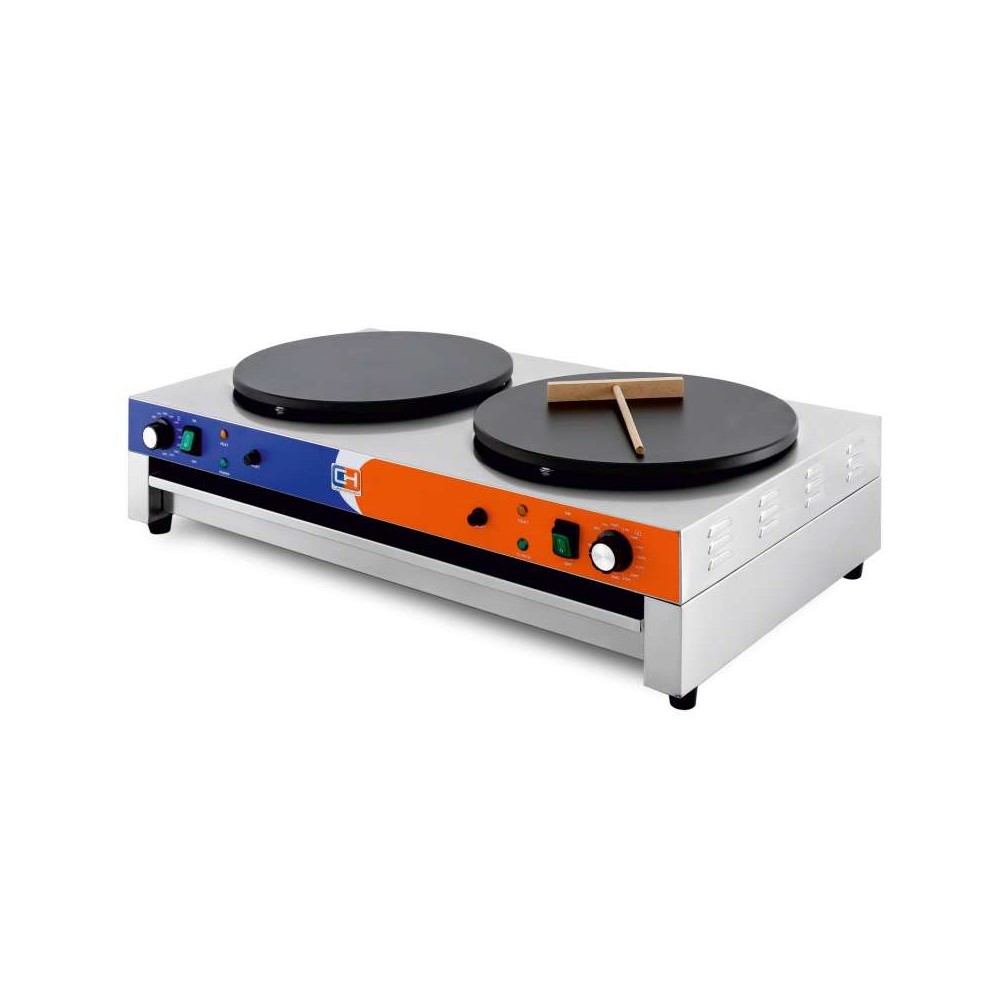 • Crepera profesional ideal para todo tipo de locales de restauración, le permitirá preparar exquisitos crepes en un abrir y cerrar de ojos. • Placa de cocción de 40 cm de diámetro fabricada en hierro fundido con recubrimiento de esmalte, lo que aporta la robustez necesaria para un uso intensivo. • Moderno y compacto diseño con una estructura muy resistente y fácil de limpiar, gracias al uso de acero inoxidable en su fabricación. • Control de temperatura de la placa mediante termostato graduable de 50 a 300°C. • Dispone de una bandeja recoge grasas y de un indicador de encendido y otro de calentamiento. • Pies de goma antideslizante que procuran la mayor estabilidad sobre la superficie de trabajo, protegiendo esta contra arañazos y marcas. • El aislante interno dirige todo el calor a la plancha de cocción, manteniendo baja la temperatura de la carcasa. • Incluye una espátula que permitirá distribuir la masa de forma uniforme.