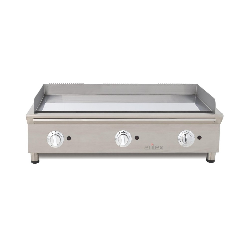 • Placa de asar de 15 mm de espesor. Peto de 100 mm de altura y 2 mm de espesor soldado por la parte superior evitando de este modo la acumulación y filtrado de grasas entre placa y petos. Fabricada en acero con baño de cromo duro de 50 micras.