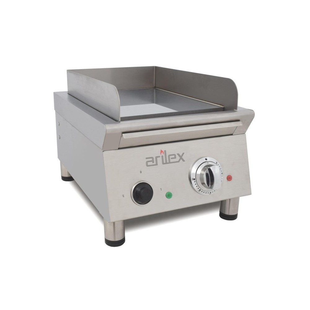 • Placa de asar de 15 mm de espesor. Peto de 100 mm de altura y 2 mm de espesor soldado por la parte superior evitando la acumulación y filtrado de grasas entre placa y petos. Fabricada en acero con baño de cromo duro de 50 micras.