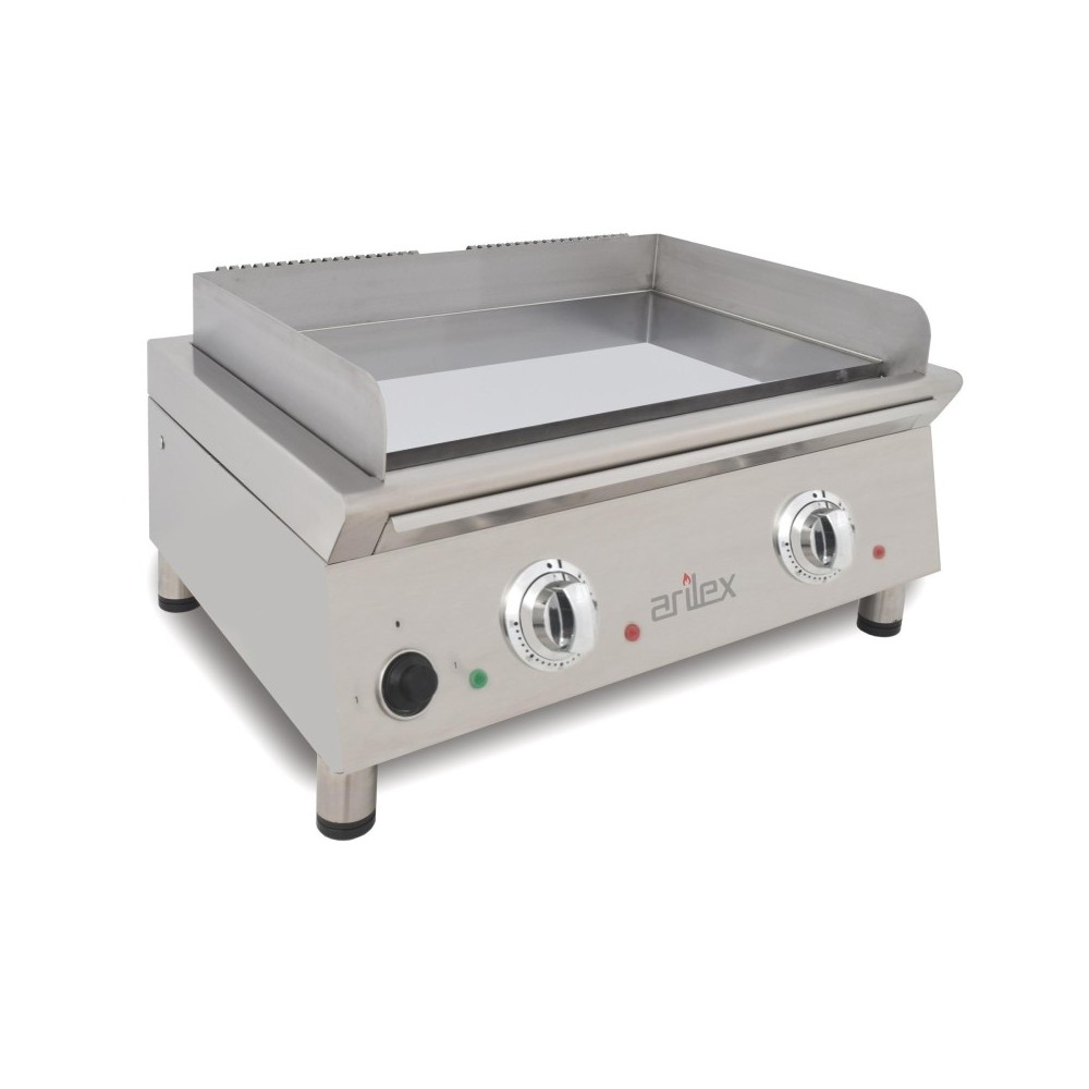 • Placa de asar de 15 mm de espesor. Peto de 100 mm de altura y 2 mm de espesor soldado por la parte superior evitando la acumulación y filtrado de grasas entre placa y petos. Fabricada en acero con baño de cromo duro de 50 micras.