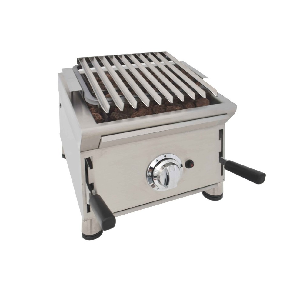 • Parrilla regulable en 3 alturas con mandos de baquelita ajustables en anclajes.