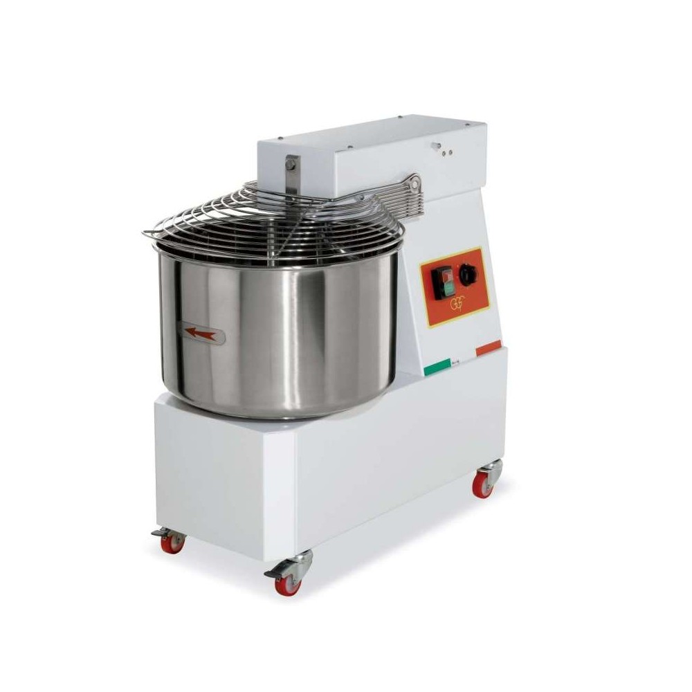 • Especialmente recomendable para panaderías, hoteles o restaurantes, sectores en los que son imprescindibles aparatos de cocina fiables y de alto rendimiento. • Mezcla con movimientos precisos y potentes todos los ingredientes necesarios para la preparación de grandes masas. • Especialmente idónea para masas de gran consistencia tales como pizza o pan. • Fabricados en Italia por fabricante de reconocido prestigio que exclusivamente fabrica maquinaria de pizzería. • Sistema de transmisión especialmente silencioso debido a un tensor para la cadena y motorreductor en baño de aceite. • Provistas de rejilla de protección en acero inoxidable y de todos los elementos eléctricos de seguridad. • Acabado exterior en pintura epoxi de color blanco. • Caldero, gancho espiral, divisor de la masa, rejilla de seguridad y demás elementos que entran en contacto con la masa fabricados enteramente en acero inoxidable. • Mandos a 24V y con botón de parada de emergencia. . • Cuba y cabezal fijo. • Dotadas de ruedas y perno para partir la masa.