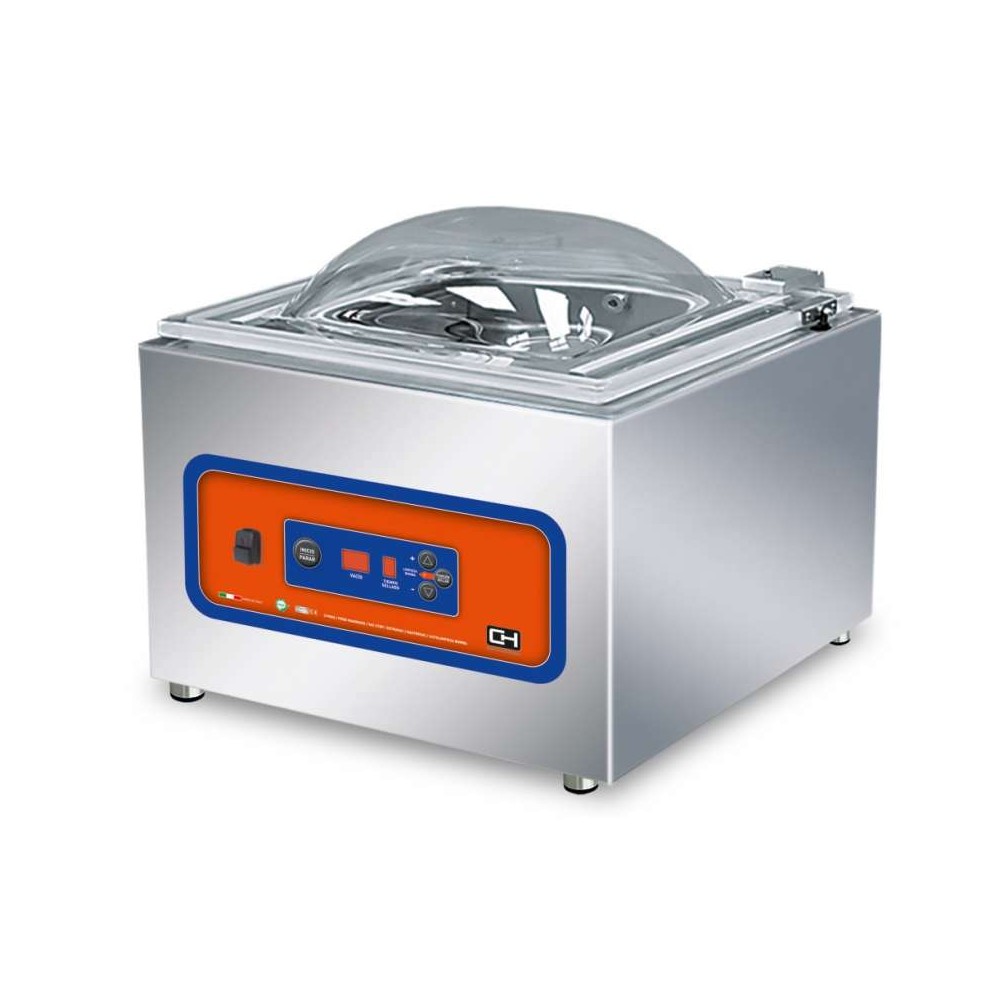 • Panel de mandos resistente a salpicaduras mediante el cual podemos realizar las siguientes operaciones: 1) Graduar el nivel de vacío y el tiempo de sellado. 2) Posibilidad de grabar y editar hasta 3 programas totalmente personalizables por el operador. 3) Equipado de serie con un programa ESPECIAL de MARINADOS de carne y pescado. 4) Programa AUTOLIMPIEZA de la BOMBA de VACÍO. Ciclo de 1 hora que se activa por el operador y permite que el aceite de la bomba alcance una temperatura elevada que hace evaporar las impurezas. 5) Función GASTROVAC. Para crear vacío en contenedores externos. 6) Función EXTRAVAC. Ofrece una segunda fase de vacío de 5 segundos especialmente indicada para carne picada y deshuesada. 7) Función VAC STOP. Parada rápida y soldadura anticipada.