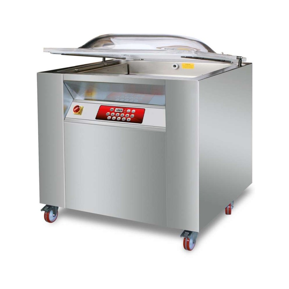 Son las máquinas ideales para el envasado al vacío en grandes centros productivos, industrias y para todos los que necesitan de una alta productividad. • Estructura fabricada completamente en acero inoxidable y cúpula de metacrilato transparente de alta resistencia que permite la visualización del proceso. • Cámara de vacío de acero inoxidable con cuba embutida y esquinas redondeadas para facilitar su limpieza. • Está dotada de cárter con apertura de 90º de modo que agiliza la asistencia, mantenimiento y el cambio de aceite de la bomba de vacío. • Barra de soldadura de alta resistencia térmica y extraible por completo para facilitar al máximo la limpieza. • Bisagras de la tapa muy resistentes fabricadas en aluminio. • La máquina es totalmente automática. El sensor de cierre activa la envasadora cuando se cierra la campana mientras que el pistón hidráulico levanta la tapa en cuanto el ciclo de vacío ha terminado. • Panel de mandos resistente a salpicaduras mediante el cual podemos realizar las siguientes operaciones: 1) PROG AUT. Tecla específica para seleccionar uno de los 20 programas de trabajo, cuyos tiempos de vacío y sellado se pueden personalizar. 2) VAC STOP. Si durante el ciclo de trabajo se pulsa una vez activa inmediatamente la soldadura y si se pulsa 2 veces seguidas se interrumpirá el ciclo permitiendo la reapertura de la campana. 3) GASTRO VAC. Permite crear vacío en contenedores exteriores. 4) STEP VAC. Habilita la función concebida para el envasado de líquidos / productos emulsionables / salsas y mermeladas. La fase de vacío se divide en 4 partes con pequeñas pausas de unos segundos para permitir que el contenido del líquido se asiente en el fondo de la bolsa evitando derrames. aceite de la bomba alcance una temperatura elevada que hace evaporar las impurezas. 5) Función EXTRAVAC. Ofrece una segunda fase de vacío de 5 segundos especialmente indicada para carne picada y des-huesada. 6) VAC%. Permite ajustar la fase de vacío indicando el porcentaje deseado. 7) SOFT VAC. Introducción progresiva de aire en el interior de la cámara, a través de pequeñas fases intercaladas con pausas, para salvaguardar con el mismo resultado final. la integridad del contenido de la bolsa. Especialmente indicado para el envasado al vacío de productos frágiles y/o blandos. 8) BOMBA DE CALOR. Activa la bomba de calor para realizar operaciones de precalentamiento del aceite en caso de temperaturas bajas. 9) AUTOLIMPIEZA de la BOMBA DE VACÍO. elimina cualquier rastro de humedad o impurezas aspiradas erróneamente durante el ciclo de trabajo. Consiste en un ciclo de trabajo de 90 minutos donde se aumenta la temperatura del circuito evaporando cualquier resto que no fuera aceite. 10) SEAL TIME. Ajuste de la duración del tiempo de sellado