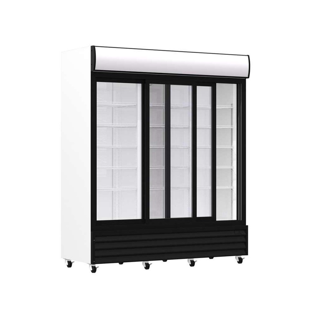 Armario expositor refrigerado con 3 puertas de vidrio deslizantes ideal para ahorrar espacio y exhibir alimentos y bebidas.