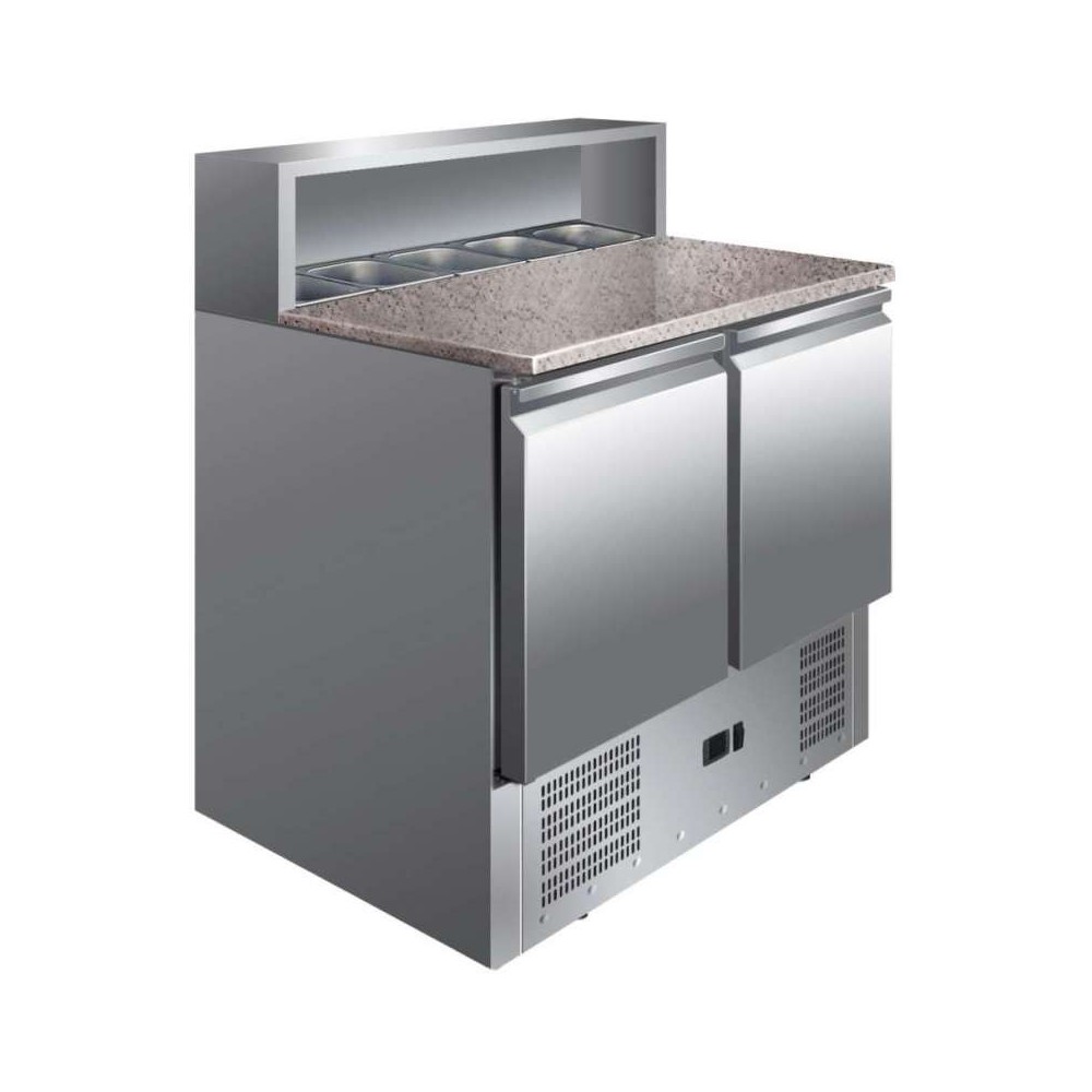 Mesa refrigerada con superficie de trabajo en acero inoxidable de fácil limpieza.
