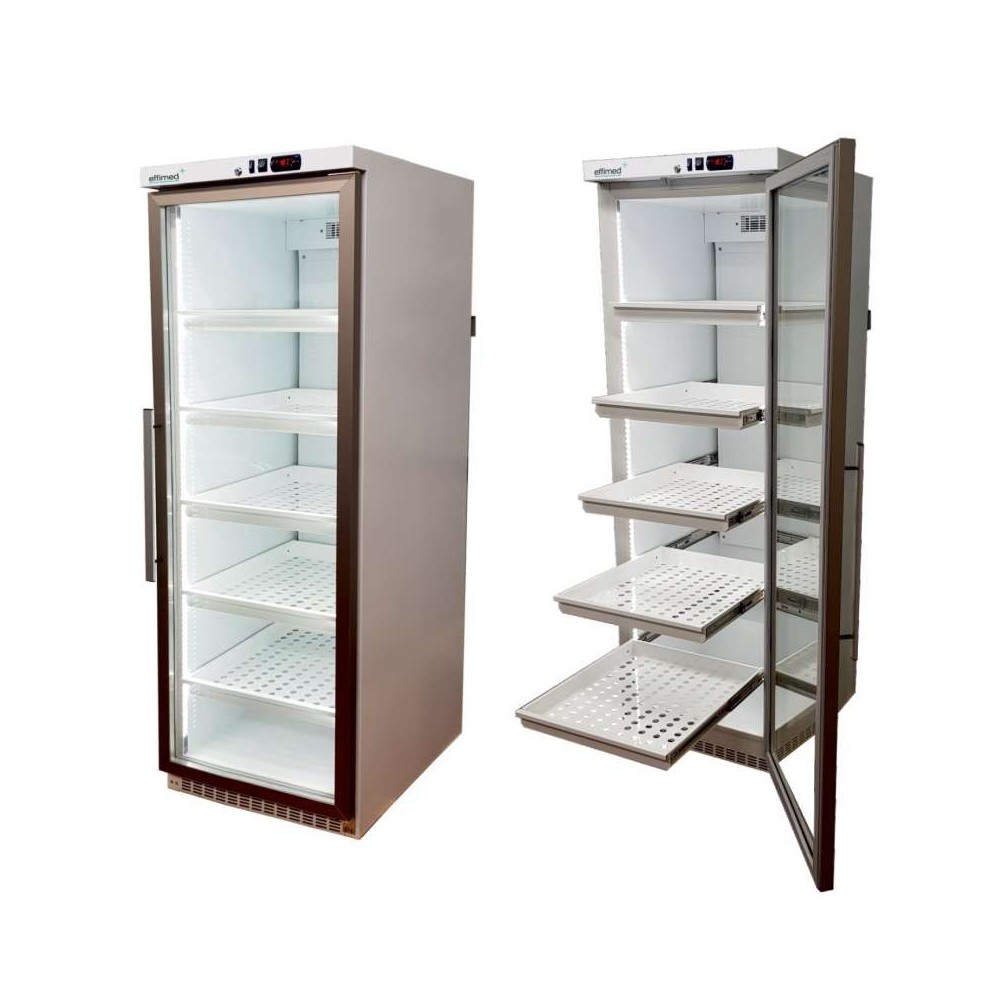 • El frigorífico para farmacia va dirigido a refrigerar medicamentos termolábiles, susceptible a los cambios de temperatura. • La temperatura de operación es de +2 a +8°C. • Dispone de una alarma sonora y visual que advierte al farmacéutico sobre la temperatura mínima y máxima, así como alarma de puerta abierta. • Se trata de un frigorífico de gran capacidad equipado con puerta de cristal que facilita al farmacéutico una amplia visión de los medicamentos. • Puerta batiente de doble cristal templado con posibilidad del cambio de sentido de apertura de la misma. • Iluminación con luz LED interior. • Exterior fabricado en chapa de acero pintada blanca e interior en ABS termo conformado. • Cubierta de evaporador con diseño especial que evita dañar los medicamentos. • Cuenta con un sistema de 5 cajones con guías telescópicas para facilitar el acceso al medicamento, con medidas 477x503 mm. • Equipado de serie con cerradura. • Dimensiones del estante: 477x503 mm. • Gas ecológico R600a. • Voltaje: 220-240V