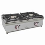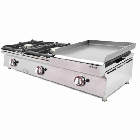 Cocina a gas sobremostrador ARILEX de 2 fuegos de 5,8 Kw por quemador Construido en acero inoxidable acabado satinado de espesor 1 mm.• Fogón con termopar de gran poder calorífico de 5,8 kW con termopar de seguridad y 60% de eficiencia certificada.• Posibilidad de convertir cualquier fogón en plancha colocando una placa de acero laminado de 6 mm. con peto sobre el fogón. Girando simplemente la parrilla encaja perfectamente una placa de 40×40 cm.• Mandos de baquelita cromada de gran calidad con marcador de máximo /mínimo.• Grasera opcional de acero inoxidable de gran capacidad para colocarse en parte trasera o frontal.• Encendido por piezoeléctrico