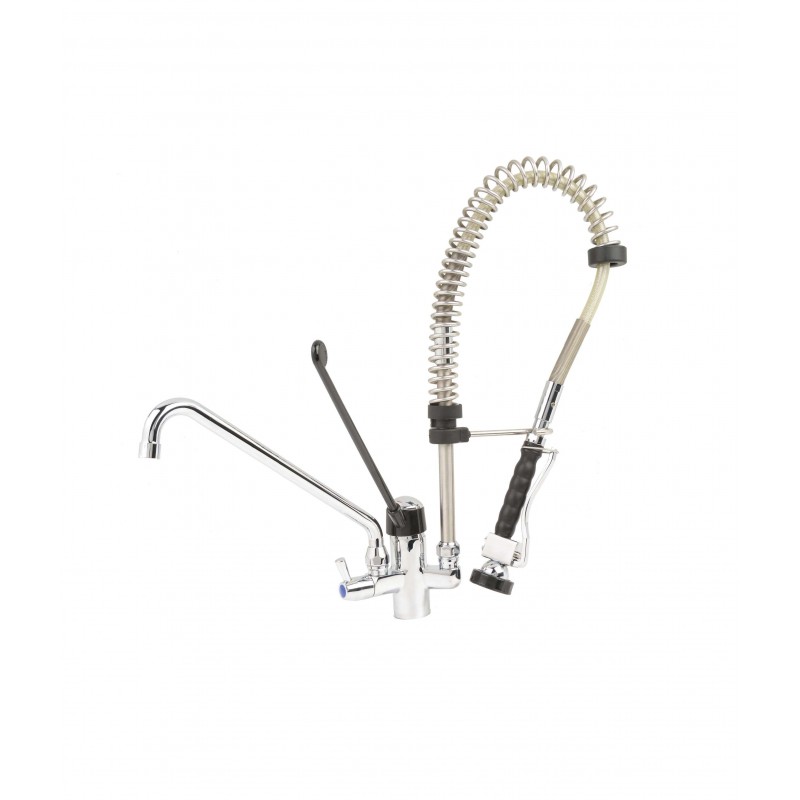 • Diseño compacto que combina en un solo elemento un grifo ducha y un grifo de cocina industrial accionado por monomando.